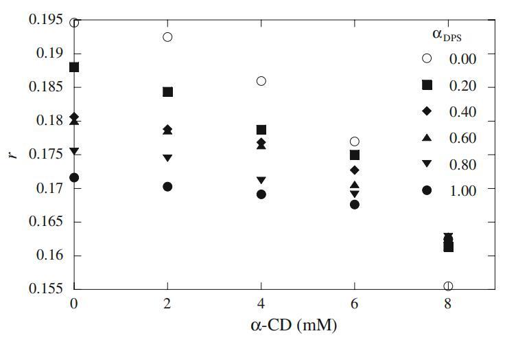 根據(jù)方程式15,我們計(jì)算了在不存在和存在α-CD的情況下當(dāng)前二元混合物的膠束組成(X1)。圖9顯示了混合膠束(X1)和體積摩爾分?jǐn)?shù)(α1)中表面活性劑的組成。從圖9可以得出結(jié)論,在αDPS=0.2時(shí),混合膠束中DPS的組成接近40%。存在α-CD時(shí)的X1值始終低于水的X1值。這種行為可能反映出α-CD通過降低其結(jié)合最強(qiáng)的表面活性劑的量來改變成分(見Ka值)。一般來說,CDs不與膠束相互作用,但CDs可能通過與溶液中的表面活性劑相互作用影響膠束的組成,從而改變膠束的平衡和組成。熒光各向異性為了研究混合膠束中兩種不同組分的行為,我們還使用RB作為熒光探針進(jìn)行了偏振熒光測量。這種探針在膠束介質(zhì)中已經(jīng)得到了很好的表征[33]。探針熒光發(fā)射的去極化程度是其激發(fā)態(tài)壽命期間旋轉(zhuǎn)擴(kuò)散的度量。熒光各向異性(r)通過Perrin方程與探針周圍的粘度相關(guān),如下[34]: