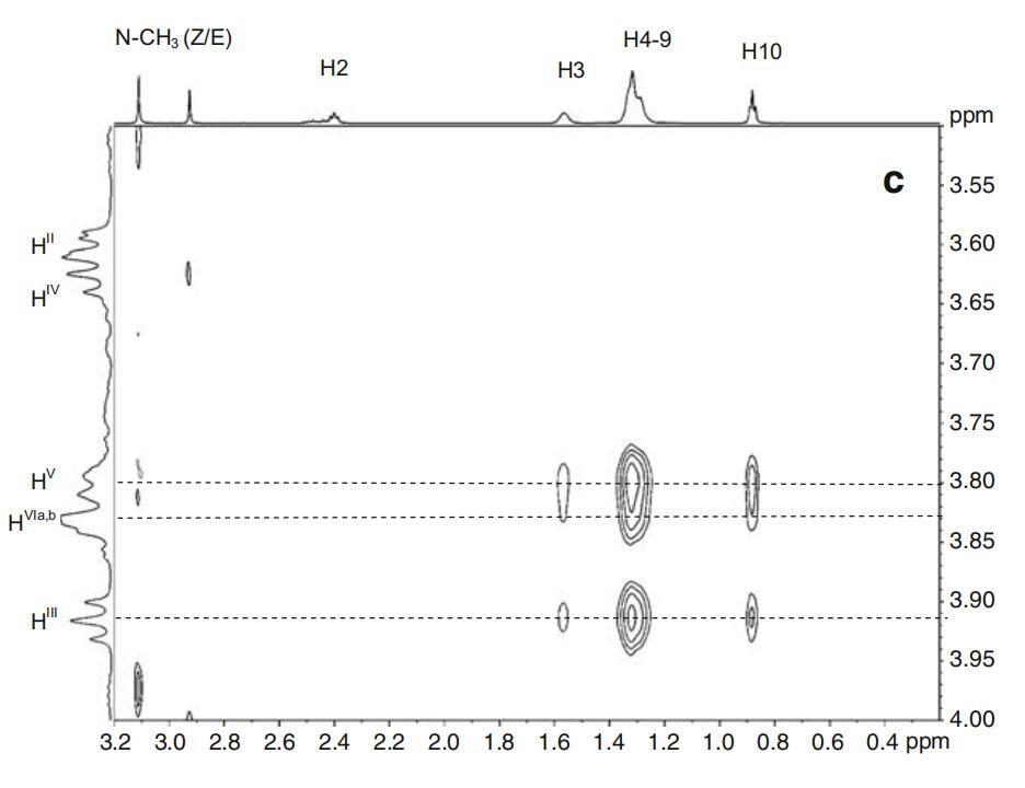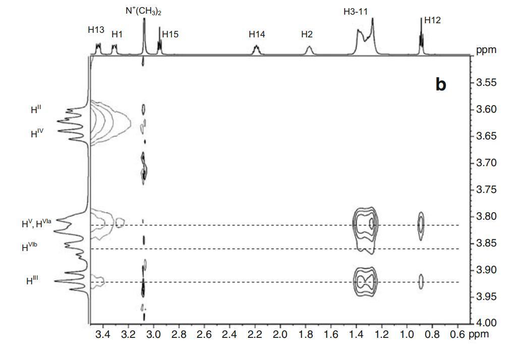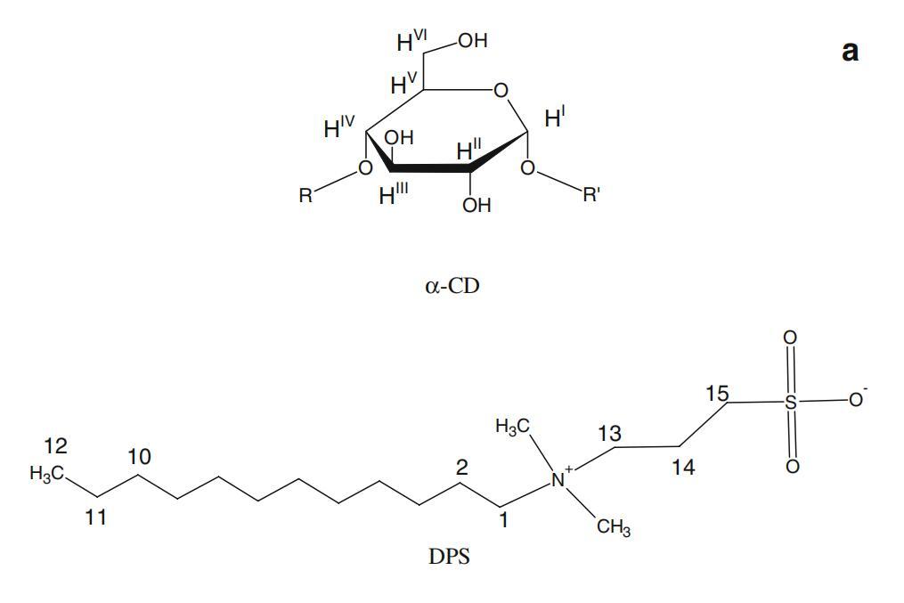 圖7a顯示了α-CD、DPS和Mega-10的示意圖,以簡化表面活性劑原子與CD原子的相互作用。2DROESY數(shù)據(jù)證明表面活性劑的烷基鏈包含在α-環(huán)糊精的疏水腔中。光譜如圖7b和c所示??梢钥吹奖砻婊钚詣┕舱衽c位于環(huán)糊精空腔內(nèi)的HIII、HV和HVI共振的交叉峰。未觀察到分子(HI、HII和HIV)外部與環(huán)糊精原子的相互作用。對于這兩種表面活性劑,與HIII和HV的相互作用似乎覆蓋了從末端甲基到H3的整個(gè)烷基鏈。這意味著幾個(gè)不同的復(fù)雜幾何形狀和穿透深度之間的快速交換。在鎘原子和親水性頭基之間沒有觀察到相互作用。