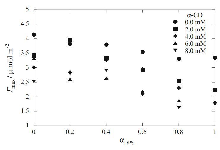 式中,γ、C、R、T和P為界面張力、表面活性劑濃度、理想氣體常數(shù)、溫度和壓力。純系統(tǒng)和混合系統(tǒng)的Γmax值如圖4所示。純Mega-10和DPS分子的Γmax值與文獻(xiàn)報(bào)道的值一致[26,28]。圖4顯示Mega-10的Γmax值略高于DPS。這一結(jié)果表明,與DPS相比,Mega-10分子在空氣-水界面以更緊湊的形式排列。兩種表面活性劑的Γmax值隨著α-CD量的增加而減小,表明表面活性劑物種從界面上的解吸(圖4)。這種行為是表面活性劑與α-CD之間存在相互作用的另一個(gè)證據(jù)。對于Mega-10和DPS在不同DPS摩爾分?jǐn)?shù)(αDPS)下的二元混合物,Γmax值隨著DPS量的增加而減小,表明DPS在界面上吸附后形成混合單層。