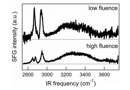 圖7。高密度水上DPPC的SFG光譜(SSP極化)(~每分子45?2)在低濃度下(~1.5 mJ/cm2)和高通量(~10 mJ/cm2),單脈沖加熱量分別在0.3至3°C(取決于紅外頻率)和2至19°C之間。為了清晰起見,對光譜進行了偏移,并根據(jù)相對紅外強度進行了縮放。注意,由于在高通量下發(fā)生的熱效應(yīng),形狀非常不同。這兩種光譜都是用非旋轉(zhuǎn)槽測量的。