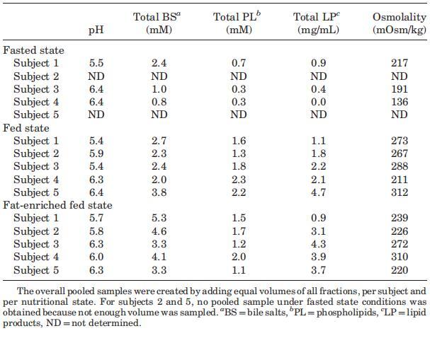 攝入Sure Plus1或Scandishake Mix1后前2小時的滲透壓通常高于禁食狀態(tài)下的HIF,盡管禁食狀態(tài)和兩種喂食狀態(tài)之間未達(dá)到顯著差異。禁食狀態(tài)滲透壓值一般為低滲透,或接近等滲透值。224 mOsm/kg的總體中值為低滲透性,與Brouwers等人1和Deferme等人報告的人類十二指腸吸出物的平均滲透壓一致。,38但高于Perez de la Cruz Moreno等人報告的平均值。24在給藥(n?3)后,在混合樣品中獲得的滲透壓較低,與Kalantzi等人11和Gisolfi等人報告的滲透壓較好。39在喂食和富含脂肪的喂食狀態(tài)下均發(fā)現(xiàn)高滲值,尤其是在消化的前3小時。在喂食和富含脂肪的喂食狀態(tài)下,總的中位數(shù)滲透壓為等滲透壓(分別為285和278 mOsm/kg)。進(jìn)食后180分鐘內(nèi)較高的滲透壓與膽汁鹽濃度、磷脂或脂質(zhì)產(chǎn)物總量無關(guān)。Kalantzi等人19將吸入十二指腸內(nèi)容物的高滲值歸因于雙糖和果糖復(fù)合碳水化合物的存在,以及后者的緩慢吸收。在本研究中未確定總碳水化合物水平,因此,該陳述無法驗(yàn)證。