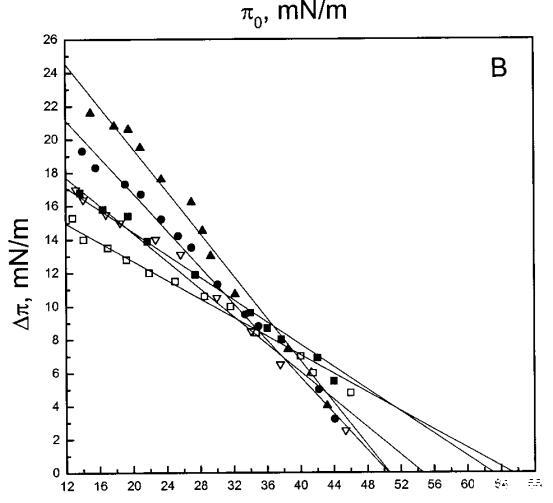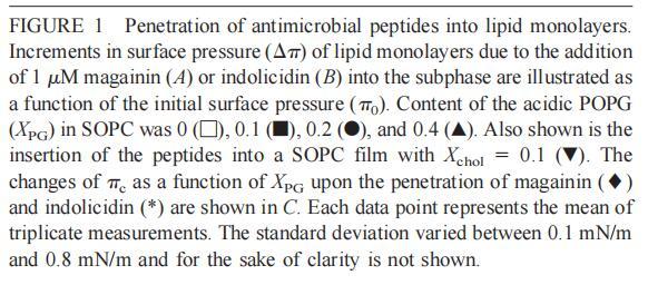 通過測量表面壓力的增量,觀察到抗菌肽在不同初始表面壓力(π0)下嵌入到空氣/水界面上的脂質(zhì)單層中(?π)將肽添加到亞相后(Brockman,1999;Verger和Pattus,1976)。Magainin 2在π0>12 mN/m時容易插入SOPC單層(圖1A),而在π0以上≈35 mN/m時,其在膜中的滲透被消除,因此該值表示該肽與SOPC膜相互作用的臨界包裝壓力πc。根據(jù)其凈正電荷4(Matsuzaki,1998),當膜中酸性磷脂POPG的含量增加時,magainin 2向脂質(zhì)單層的滲透逐漸增強(圖1 A)。因此,消除magainin 2插入單層的πc值增加至~39(XPG=0.1)、43(XPG=0.2)和46 mN/m(XPG=0.4)(圖1c)。相反,在SOPC膜中加入膽固醇(Xchol=0.1)對magainin 2的滲透沒有顯著影響(圖1A)。