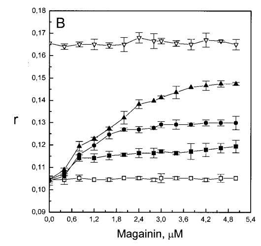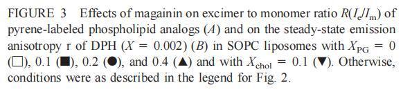 有趣的是,在存在酸性磷脂的情況下,肌動蛋白/脂質(zhì)的摩爾比(在該摩爾比下,肌動蛋白的初始增量趨于穩(wěn)定)分別為1:21、1:16和1:12.5,對應于XPG=0.1、0.2和0.4(圖2A),分別產(chǎn)生1:2、1:3和1:5的肌動蛋白/磷脂化學計量比。同時,DPH的初始r增量在magainin/脂質(zhì)摩爾比為~1:30、1:12和1:5時趨于平穩(wěn)(XPG分別為0.1、0.2和0.4),對應于大約1:3、1:2.5和1:2的magainin/PG化學計量比(圖3)。據(jù)報道,在這些肽/脂質(zhì)摩爾比下,magainin可插入含酸性磷脂的膜中(Ludtke等人,1994年)。此外,已經(jīng)證明,雙分子層中magainin的=-螺旋的方向取決于肽與脂質(zhì)的摩爾比,在上述化學計量比下,螺旋應垂直于膜表面插入,在含PG的膜中形成孔(Ludtke等人,1996)。這些孔不僅由兩親螺旋的極性面組成,而且還由脂質(zhì)的極性頭基組成,內(nèi)外單層通過這些孔襯脂質(zhì)是連續(xù)的。膜中的這種結構可能會降低探針芘部分微環(huán)境的極性,從而提高其量子產(chǎn)率。有趣的是,當XPG>0.1時,magainin 2逐漸降低Ie/Im值(圖3 A),這與增強的?;滍樞驕p少脂質(zhì)側向擴散的速率一致。然而,由于magainin 2已經(jīng)在XPG=0.1時增加了r,Ie/Im沒有變化,我們可以得出結論,PPDPG探針向微區(qū)富集以及其橫向擴散的減少正在發(fā)生。