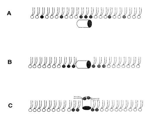 對于測試的所有單層組成,吲哚青霉素的πc值超過了馬蓋寧2的測量值(圖1 c),表明該肽在?;溨g有效插入和插層。吲哚西丁在~38 mN/m的交叉點值得關注。在后一個表面壓力之下,表面壓力的增量??在PG存在的情況下,吲哚西丁引起的反應增強,而在較高的初始脂質(zhì)堆積密度下觀察到相反的反應。有趣的是,不管脂質(zhì)成分(即PG的存在)如何,交叉點幾乎保持不變,因此表明它可以完全由表面壓力決定,而不管靜電相互作用如何。一種可能的機制是,在π0>38 mN/m時,吲哚西丁以壓力依賴的方式改變其在單層中的取向,可能是從其長軸相對于層平面的平行到垂直取向(圖9,B和C),從而減少面積/肽并減少?π.此外,一些靜電結合吲哚肽的PG分子也可能與單層中的磷脂方向不同。換句話說,吲哚西丁與其相關的PG將形成一種超分子復合物,其取向將取決于壓力。這在圖9中示意性地示出。重要的是,所提出的肽連接磷脂的重新定向將與最近提出的模型兼容,在該模型中,穿過雙層的孔表面的一部分將由脂質(zhì)頭基構成(Ludtke et al.,1996)。