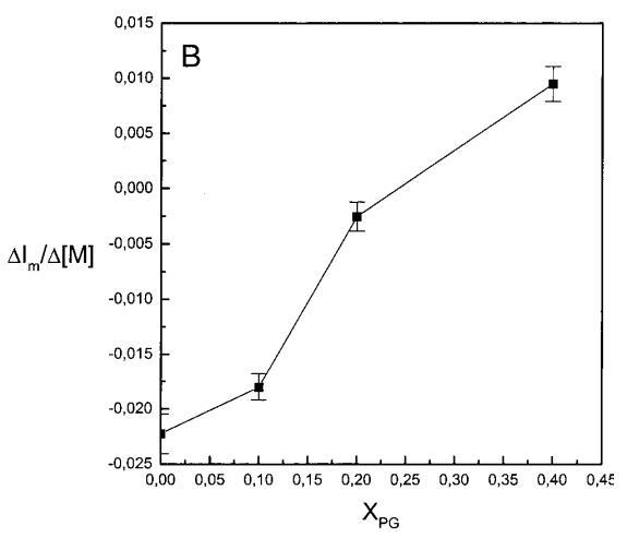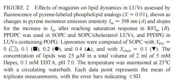 繼上述單層研究之后,有興趣探索肽對脂質(zhì)動力學的影響。這是通過使用熒光光譜和不同脂質(zhì)成分的LUV完成的,記錄芘標記的熒光磷脂類似物PPDPC或PPDPG的發(fā)射光譜(均為X=0.01)。對于SOPC LUV,添加magainin 2導致芘熒光顯著猝滅,芘單體和準分子發(fā)射強度平行降低,如Im所示(圖2)。作為XPG的一項功能,還研究了馬蓋寧2與脂質(zhì)體結合的后果。當XPG從0.1增加到0.4時,觀察到由于magainin 2在398 nm處逐漸增強的Im(RFIm),而Im的初始增量在明確定義的PG/magainin 2化學計量比~2、3和5時趨于平穩(wěn)(圖2 A)。在這個初始階段之后,直到給定的化學計量比,還有第二個過程,其斜率也隨著XPG的增加而增加(圖2b)。在XPG=0和0.1時,Magainin 2僅引起Ie/Im的輕微變化,而在XPG=0.2和0.4時,分別減少10%和25%是明顯的(圖3 A)。為了區(qū)分脂質(zhì)動力學中兩種性質(zhì)不同的變化,即側向遷移率和微結構域形成,作為上述Ie/Im變化的根本原因,我們還通過測量DPH的熒光各向異性r來評估?;滍樞虻淖兓▓D3 B)。在缺乏酸性磷脂的情況下,Magainin 2幾乎不會引起r的變化(圖3B)。然而,隨著XPG的增加,加入magainin 2后脂質(zhì)堆積和酰基鏈順序逐漸增加(圖3b),XPG=0.4時,r最大增加1.4倍。值得注意的是,XPG=0.1時Ie/Im沒有變化以及?;滍樞虻脑黾颖砻鱌PDPG正在發(fā)生微觀富集。有趣的是,在存在膽固醇(Xchol=0.1)的情況下,由于馬蓋寧2的作用,Im和Ie都顯著降低,Ie/Im的變化不顯著(圖2A和3A)。如前所述(van Ginkel et al.,1989),添加肽前r的增加(圖3 B)揭示了通過在膜中摻入膽固醇而增強的膜順序。然而,在膽固醇存在的情況下,magainin 2對r沒有進一步的影響(Xchol=0.1,圖3b)。