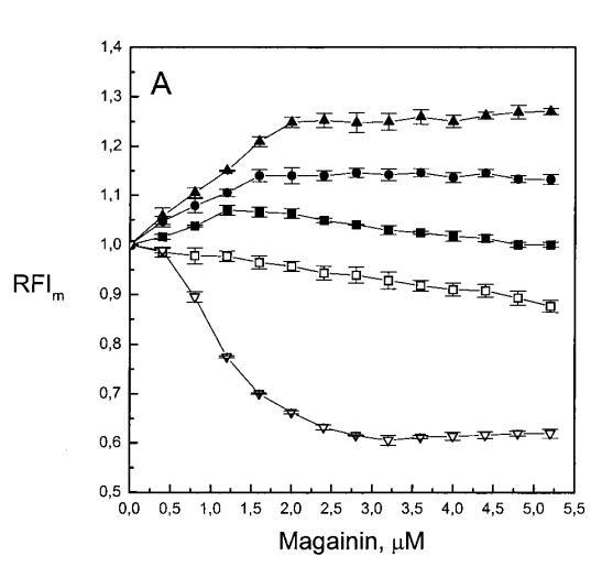 除上述相似性外,當使用芘標記的脂質(zhì)類似物研究酸性磷脂對脂質(zhì)動力學的影響時,兩種肽之間也存在明顯差異。Magainin 2導致兩性磷脂組成的LUV的芘發(fā)射顯著猝滅(圖2A)。然而,在PG存在的情況下,芘的單體強度增加,XPG逐漸增加了這種效應的幅度(圖2A)。圓二色性、拉曼光譜、傅里葉變換紅外光譜和固態(tài)核磁共振研究表明,馬蓋寧在與脂質(zhì)雙層結合時采用螺旋構象(Matsuzaki等人,1989年、1991年;Williams等人,1990年;Jackson等人,1992年;Bechinger等人,1993年;Wieprecht等人,1997年;Hirsh等人,1996年)。magainin 2對兩種膜的這些不同影響可能是由于1)通過與肽的帶正電基團(例如賴氨酸的?氨基)直接接觸使芘熒光猝滅,或2)插入雙層的=-螺旋肽改變熒光團的微環(huán)境,與層平面平行,如上所述。然而,在PG存在的情況下,肽的正電荷應在與酸性磷脂形成靜電復合物時被中和,從而減少由于π-陽離子相互作用導致的芘熒光猝滅。