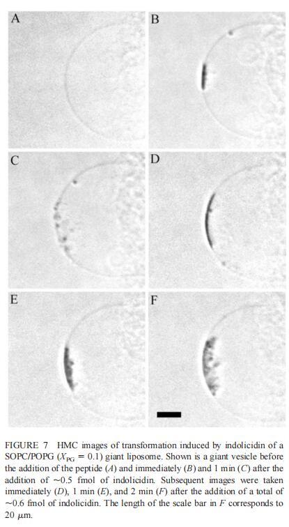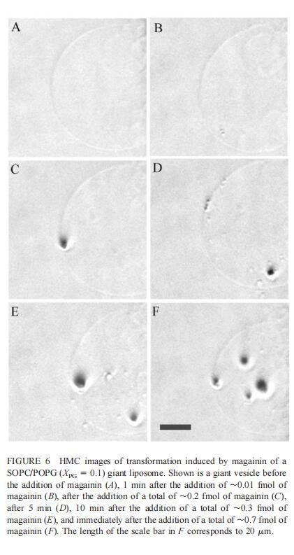 由于上述magainin 2和吲哚西啶對單層和LUV具有明顯的脂質(zhì)成分依賴性作用,因此有興趣使用巨型脂質(zhì)體比較這些肽對宏觀膜的三維拓撲結構的影響,無論是否含有PG,都可以在交流電場中形成由SOPC組成的巨大脂質(zhì)體。即使暴露于大量肽(~2 fmol,~4 pl=200次重復注射,數(shù)據(jù)未顯示),SOPC膜也不受magainin 2的影響。同樣,由SOPC和膽固醇(Xchol=0.1)組成的巨大脂質(zhì)體也不受此量的馬蓋寧2的影響(數(shù)據(jù)未顯示)。然而,在存在POPG(XPG=0.1)的情況下,已經(jīng)~0.01 fmol(單次~20 fl注射)的magainin 2應用于巨大囊泡表面,顯著影響巨大脂質(zhì)體膜的拓撲結構(圖6 B)。更具體地說,在~1分鐘內(nèi),小顆粒(θ≈0.9米)出現(xiàn)在巨大的囊泡內(nèi)。隨后注射高達~0.1 fmol(約200 fl)的magainin 2不會引起進一步的可見變化。在總共添加約0.2 fmol的肽后,膜開始起伏,形成致密顆粒(θ≈4 m)在巨大脂質(zhì)體內(nèi)可見(圖6 C)。在~5分鐘內(nèi),幾個小顆粒(θ≈0.9 m)出現(xiàn)在巨大脂質(zhì)體膜的內(nèi)表面(圖6 D)。隨后,大多數(shù)小顆粒進入巨大囊泡的內(nèi)腔。這些內(nèi)吞小泡似乎在巨大脂質(zhì)體內(nèi)自由移動,在隨后30分鐘的觀察中沒有進一步的變化。進一步注射magainin 2,提供總共0.3 fmol的肽,引起類似內(nèi)吞作用的過程,出現(xiàn)直徑約8 m的致密顆粒(圖6 E)。約10分鐘后,巨大脂質(zhì)體內(nèi)約0.9-m顆粒的數(shù)量繼續(xù)增加。偶爾,這些顆粒也出現(xiàn)在巨大囊泡的外表面,并釋放到外部緩沖液中(圖6 E)。隨后添加magainin 2(~0.7 fmol)使膜不穩(wěn)定并誘導進一步的囊泡形成(圖6 F)。這些內(nèi)吞囊泡在巨大脂質(zhì)體內(nèi)彼此分離,巨大囊泡的大小明顯減?。▓D6f)。最終,在進一步添加magainin 2(高達~1.5 fmol)后,巨大的脂質(zhì)體膜崩塌。上述形態(tài)學變化具有高度的可重復性。