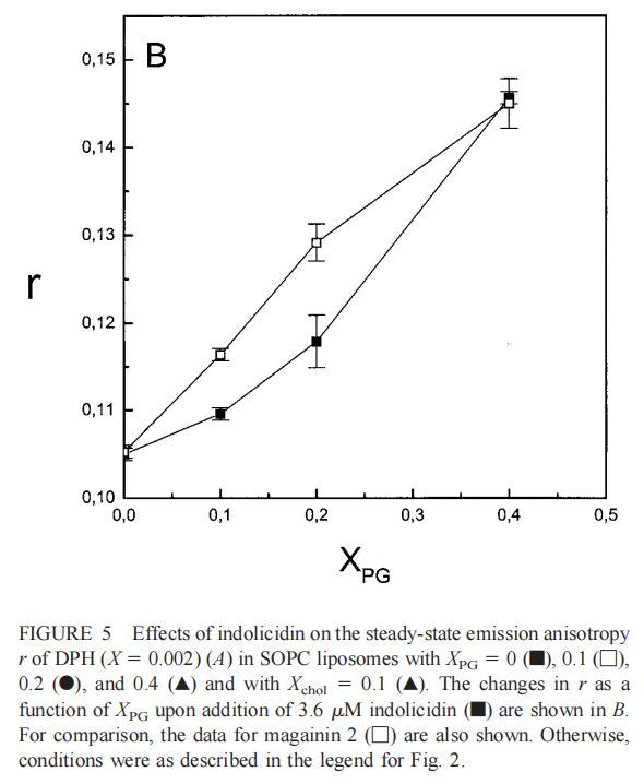 雖然熒光光譜顯示,馬蓋寧2和吲哚西啶對脂質(zhì)動力學的影響存在明顯差異,但也存在一些明顯的相似之處。因此,DPH各向異性r的增加表明,在存在酸性磷脂的情況下,這兩種肽都會導致?;滍樞虻脑黾?,這種影響的程度隨著XPG的增加而增加(圖3b和5b)。同樣,在膽固醇存在的情況下,兩種肽對芘熒光的有效猝滅也很明顯(圖2a和4a)。這可能與膽固醇的OH基團和馬蓋寧的E19殘基之間的相互作用有關(Tytler等人,1995年),該肽在膜中具有跨膜取向。當Xchol=0.1時,r值的增加是由于吲哚西丁所致,而馬加寧則無影響。這表明,在膽固醇存在的情況下,吲哚肽可能采用跨雙層取向,其長軸垂直于雙層平面。
