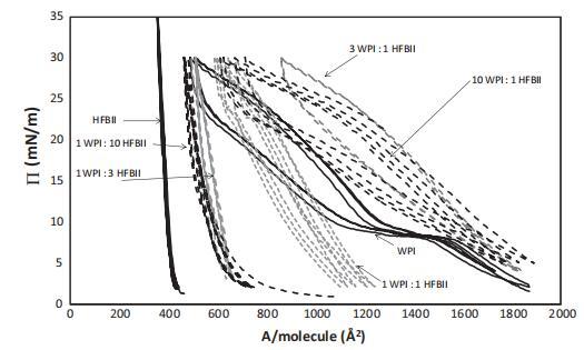 圖1。純蛋白質系統(tǒng)WPI(右)和HFBII(左)以及口糧WPI:HFBII為10:1、3:1、1:1、1:3和1:10的混合系統(tǒng)的表面壓力等溫線。