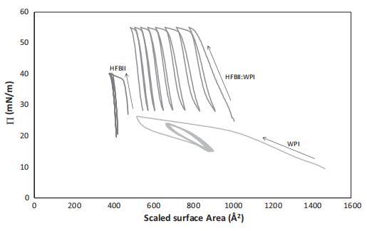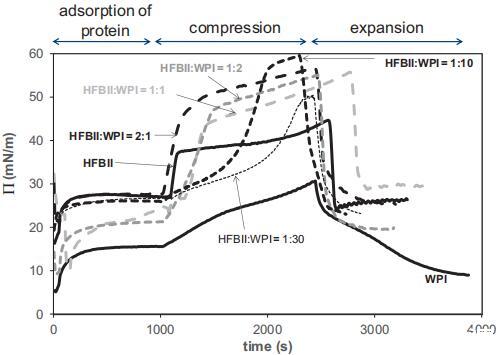 值得注意的是,對于純HFBII,П–A等溫線在連續(xù)的壓縮膨脹循環(huán)中不會發(fā)生變化,這再次表明HFBII不可撤銷地附著在界面上,幾乎沒有任何構象變化。對于純WPI和1:1混合物,П–A等溫線略微向較小區(qū)域移動,這表明由于WPI分子的構象變化、多層形成或如前所述,由于WPI的解吸,表面重排的可能性較小。