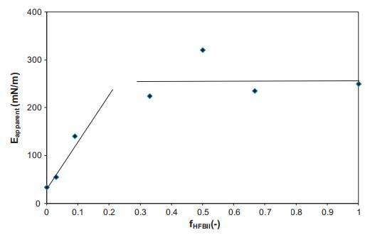 為了便于比較,從圖1的數(shù)據(jù)中,使用表面壓力第一次上升的斜率(由第一次壓縮產生)和公式E=(?2)提取了表觀膨脹模量(E)??1)/ln(A1/A2)。曲線的斜率總是在表面壓力在15到25 mN/m之間波動的表面積范圍內確定的。圖2顯示了表觀模量作為混合比的函數(shù),表示為HFBII分數(shù)fHFBII=cHFBII/(cHFBII+cWPI)。