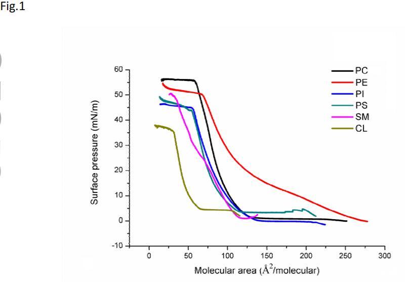 圖1顯示了空氣-水界面上不同磷脂單層的π-A曲線形狀。這里測試的所有磷脂的π-A曲線的形狀都是在所有顯示的表面壓力下單一液體膨脹(LE)和液體冷凝(LC)狀態(tài)的特征。在壓縮時,單層經(jīng)歷了一個轉(zhuǎn)變,這被視為從LE(低于10 mN/m)到LC狀態(tài)的轉(zhuǎn)變。在高分子區(qū)域,由于分子堆積的增加,表面壓力升高,但不改變單層膜的彈性。最后,單分子膜達到了一種更為濃縮的狀態(tài),但在π-a等溫線的形狀中沒有明顯的崩塌點。對于這里測試的磷脂,它們都可以形成穩(wěn)定的膜,并表現(xiàn)出良好的壓縮性能,DOPC的表面壓力甚至達到57 mN/m。