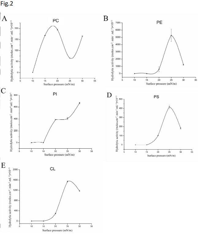 圖2示出了使用各種磷脂作為水解底物獲得的詳細活性-表面壓力曲線??梢钥闯?,酶的水解活性高度依賴于表面壓力。然而,每種底物的活性曲線不同。發(fā)現(xiàn)基板PE、PS和CL的鐘形曲線具有特征性的最佳表面壓力值(圖2B、D、E)。在低于15 mN/m的表面壓力下,未檢測到基本酶活性。水解活性隨表面壓力的增加而增加。在25 mN/m的表面壓力下,觀察到PE、PS和CL的最大活性。然而,當表面壓力高于25 mN/m時,所有這些磷脂的水解活性降低。與所有測試的底物相比,在25 mN/m的表面壓力下,PE的水解率最高,水解活性達到5272.31×10-11摩爾。cm-2。最小-1。mL-1。對于PI,在15 mN/m以下也沒有觀察到水解速率,但是,沒有觀察到鐘形曲線,并且隨著表面壓力從15 mN/m增加到30 mN/m,活性增強(圖2C)。對于PC,從10 mN/m到25 mN/m觀察到鐘形曲線,但在30 mN/m的表面壓力下,活性進一步增加。隨著表面壓力從25 mN/m增加到30 mN/m,表面輪廓上的單層構(gòu)象可能發(fā)生了變化,導致活性增加。在本實驗中,在測試的表面壓力范圍內(nèi),SM沒有活性。從π-A曲線可以看出,在25 mN/m的表面壓力下測試的所有磷脂都處于液態(tài)冷凝狀態(tài),沒有達到各自的坍塌壓力。在這種情況下,超卵磷脂酶對不同單分子磷脂膜的偏好順序為PE>CL>PS>PI>PC。在這些條件下,SM沒有活性。Lecitase Ultra選擇性的詳細機制仍需闡明。
