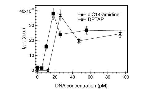 隨著DNA濃度的增加,有五個(gè)因素可能會(huì)導(dǎo)致OD拉伸光譜響應(yīng)的變化。(i)由于脂質(zhì)與聚陰離子DNA的相互作用,DC界面場(chǎng)可能會(huì)發(fā)生變化(其中初始場(chǎng)是帶電脂質(zhì)頭基(DPTAP和diC14氨基)和兩性離子頭基(DPPC)偶極子的結(jié)果,伴隨DNA吸附的場(chǎng)變化預(yù)計(jì)只會(huì)調(diào)制光譜振幅)。(ii)新結(jié)構(gòu)類型的水(與新受體或供體氫鍵的水)的產(chǎn)生,預(yù)計(jì)會(huì)改變OD拉伸中心頻率和線型,并且其他類型界面水的密度保持不變,導(dǎo)致光譜振幅增加。(iii)被吸附的DNA可以置換界面水,導(dǎo)致界面水分子數(shù)量減少(如果DNA置換所有“類型”的水的程度相同,這種置換只會(huì)導(dǎo)致光譜振幅降低)。(iv)DNA的吸附可能會(huì)產(chǎn)生額外的非中心對(duì)稱區(qū)域(即,脂質(zhì)-水界面可能會(huì)改變?yōu)橹|(zhì)-水-DNA-水界面)。如果吸附在DNA螺旋另一側(cè)的水分子發(fā)生破壞性干擾,這將導(dǎo)致光譜振幅降低。(v)吸附的DNA可能會(huì)導(dǎo)致界面水分子重新定向,從而使它們的OD拉伸振幅(在我們的實(shí)驗(yàn)幾何中很明顯)顯著降低。