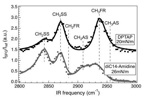 圖6。diC14 amdine在26 mN/m(灰色)下的SFG光譜(點(diǎn))和DPTAP(黑色)在20 mN/m下的SFG光譜(點(diǎn))。垂直線表示亞甲基對(duì)稱拉伸(CH2SS)、甲基對(duì)稱拉伸(CH3SS)、亞甲基非對(duì)稱拉伸費(fèi)米共振(CH2FR)、亞甲基非對(duì)稱拉伸(CH2AS)的位置,甲基對(duì)稱拉伸費(fèi)米共振(CH3FR)和甲基不對(duì)稱拉伸(CH3AS)。為清晰起見(jiàn),DPTAP頻譜偏移。實(shí)體曲線使用洛倫茲模型擬合數(shù)據(jù)。