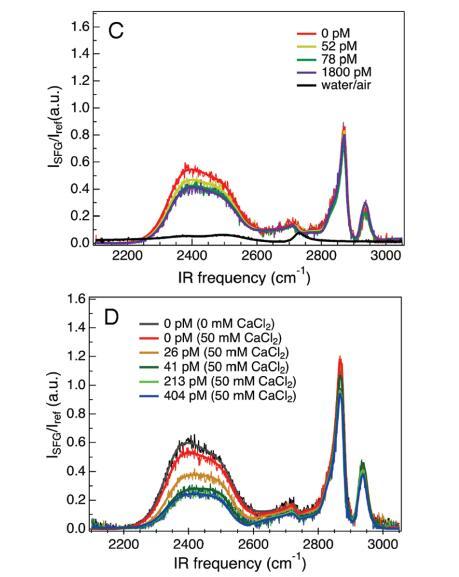 圖2。VSF光譜是OD拉伸區(qū)2100-2700 cm-1和CH拉伸區(qū)2850-2975 cm-1的DNA濃度的函數(shù)。陽(yáng)離子脂質(zhì)單分子膜的脂質(zhì)密度為52?2/分子,兩性離子脂質(zhì)單分子膜的脂質(zhì)密度為47?2/分子。A組為DPTAP單層下的VSF光譜,B組為diC14氨基單層下的VSF光譜,C組為DPPC單層下的VSF光譜,D組為含有額外50 mM CaCl2的DPPC單層下的VSF光譜。所有實(shí)驗(yàn)中的亞相都是磷酸鹽緩沖的。每個(gè)面板中的單個(gè)光譜是具有不同濃度λ-DNA噬菌體的相同系統(tǒng)。每個(gè)面板中都顯示了該頻率窗口的磷酸鹽緩沖D2O光譜,以供比較。實(shí)體曲線使用公式1擬合數(shù)據(jù)。