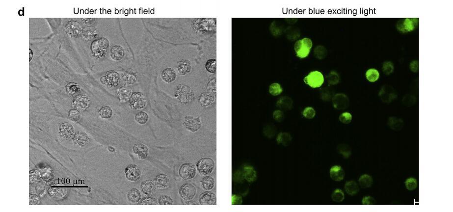 然后,我們進(jìn)一步評(píng)估了基于體外共培養(yǎng)系統(tǒng)的細(xì)胞選擇性,該系統(tǒng)包含HL60癌細(xì)胞和HDFa原代細(xì)胞,它們與體內(nèi)環(huán)境非常相似[8]。將最終濃度為20 mM的FITC-G(IIKK)3I-NH2添加到系統(tǒng)中,培養(yǎng)1 h后,用熒光顯微鏡觀察兩種細(xì)胞中的肽分布(圖1d)。很明顯,綠色熒光集中在懸浮和圓形HL60細(xì)胞中,而不是粘附和紡錘形HDFa細(xì)胞中,這再次表明肽具有良好的細(xì)胞選擇性,以及對(duì)癌細(xì)胞的快速識(shí)別。