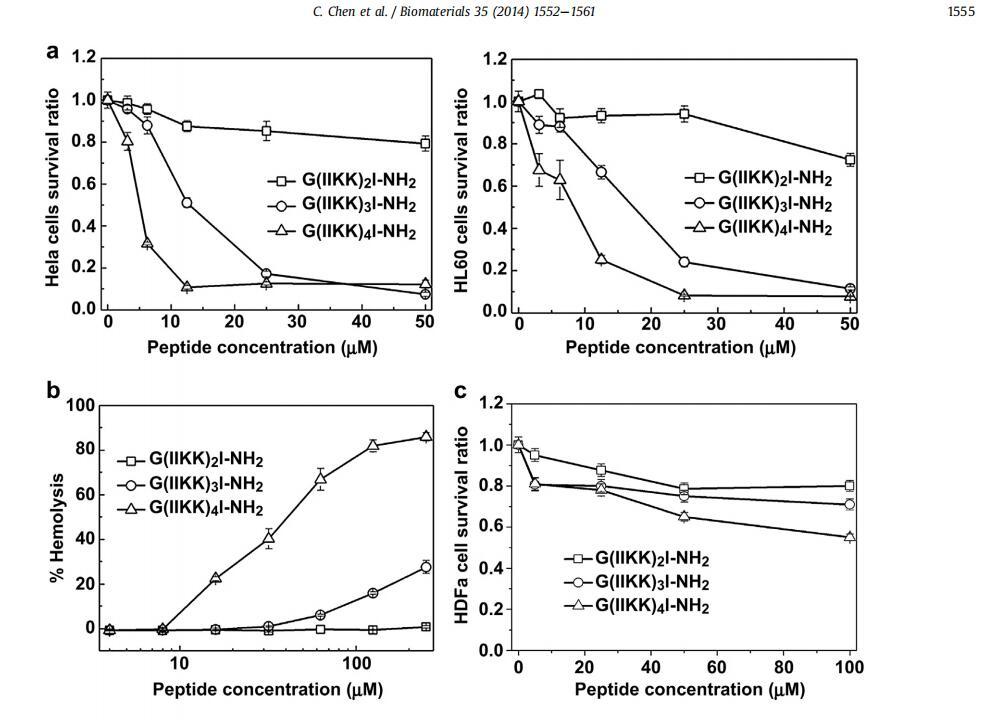 按照濃度依賴性模式,重復(fù)次數(shù)較多或長(zhǎng)度較長(zhǎng)的肽在殺死癌細(xì)胞(HeLa和HL60細(xì)胞)方面更有效,但對(duì)正常細(xì)胞(紅細(xì)胞和HDFa細(xì)胞)的體外毒性也開(kāi)始增加,如圖1aec所示。總的來(lái)說(shuō),就體外抗癌活性和細(xì)胞選擇性而言,G(IIKK)3I-NH2是最佳序列,其對(duì)HeLa和HL60細(xì)胞的IC50值為15和25 mM,EC50遠(yuǎn)大于250 mM(IC50:濃度導(dǎo)致50%的癌細(xì)胞生長(zhǎng)抑制;EC50:濃度誘導(dǎo)50%的紅細(xì)胞溶解)。重要的是,HDFa細(xì)胞對(duì)這些肽有良好的耐受性,例如,在濃度低于50 mM時(shí),G(IIKK)3I-NH2對(duì)HDFa細(xì)胞的影響微不足道(圖1c)。我們合理設(shè)計(jì)的短肽的這種性能明顯優(yōu)于天然AMP,如馬蓋寧和蜂毒素,并且在有效性、選擇性甚至耐藥性方面也優(yōu)于抗癌藥物順鉑[12e15]。例如,在類似的實(shí)驗(yàn)條件下,magainin-2對(duì)HeLa細(xì)胞的IC50低于60 mM,而蜂毒肽在5 mM下的EC50則低得多,顯示出對(duì)宿主細(xì)胞的高毒性[12e14]。