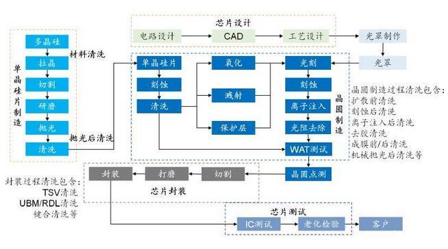 芯片制造技術(shù)的進(jìn)步驅(qū)動(dòng)半導(dǎo)體清洗技術(shù)快速發(fā)展。在單晶硅片制造中,光刻,刻蝕,沉積等工藝后均設(shè)置了清洗工藝,清洗工藝在芯片制造進(jìn)程中占比最大,隨著芯片技術(shù)節(jié)點(diǎn)不斷提升,對(duì)晶圓表面污染物的控制要求也越來越高。