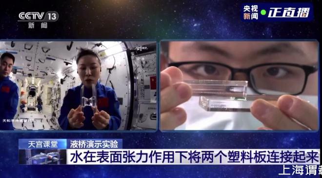 王亞平解釋,在地面重力的環(huán)境下,水的表面張力微不足道,所以同學(xué)們無法用純水做出一個(gè)液橋。而在太空中,由于重力消失,液體表面張力就可以用液體搭建出一座橋。