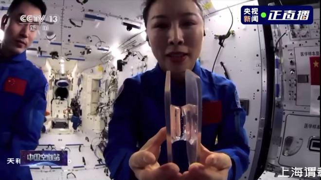 由葉光富將航天員平時(shí)所喝的飲用水慢慢傾倒在液橋板上。