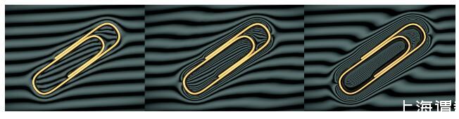 在這個(gè)例子中我們成功使密度大于水的回形針漂浮在水面上,水面下面的條狀背景會(huì)因?yàn)樗娴膹澢冃?,從左到右回形針的密度逐漸增大,中間條紋的密度也在逐漸增加。在最右邊的場(chǎng)景中,回形針的密度達(dá)到了7.9 g/cm^3(金屬鐵的密度),是水密度的將近8倍,但是依然可以依靠表面張力漂浮起來(lái),得到的條紋分布與真實(shí)圖片最為接近。