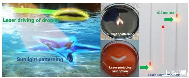 研究中,王志明團隊也展示了一些基本應用示例,比如借助激光和日光可以在液體表面雕刻圖形,還可讓激光搬運液體,讓激光驅(qū)動毛細管中的液體,讓激光驅(qū)動液體表面液滴、甚至驅(qū)動不同液滴發(fā)生化學反應的應用。