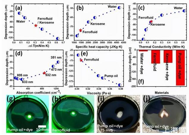 他們發(fā)現(xiàn),液體的厚度、表面張力的溫度系數(shù)、熱導、比熱容、吸光性和粘度等物理參數(shù),都會對光致液體形變產(chǎn)生重要影響,尤其是吸光系數(shù)和液體的表面張力溫度系數(shù)。