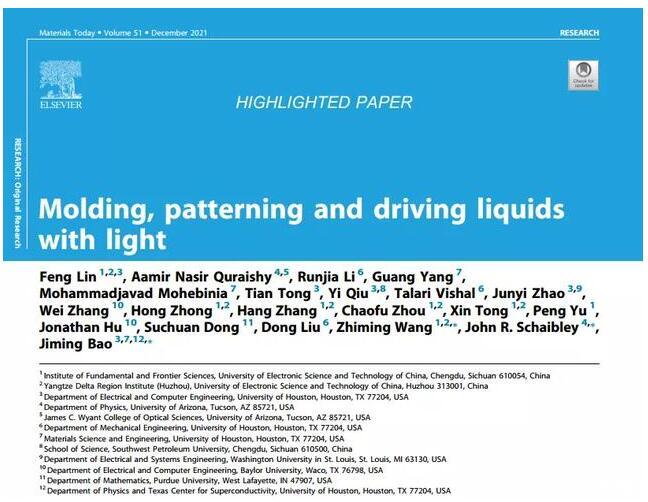 該論文以電子科技大學第一單位發(fā)表在國際頂級期刊Materials Today上,并被期刊主編選為Highlighted paper作為亮點工作報道,論文題為《光驅(qū)動液體塑模、繪畫和運動》(Molding,patterning and driving liquids with light)[1]。