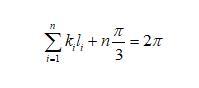假設(shè)二維干泡沫中的任一氣泡如圖3b所示,氣泡的邊數(shù)為n,從a點開始,再回到a的邊長分別標記為l1到ln,每邊所對應(yīng)的曲率為k1到kn(Plateau第一定律)?,F(xiàn)在假設(shè)有一點從a點沿著邊向b運動,到b點時,所走的路徑為l1,轉(zhuǎn)動的角度為這條邊所對應(yīng)的圓心角(向外為正,向內(nèi)為負值),為k1*l1。此時要想繼續(xù)沿著邊運動,需要向內(nèi)轉(zhuǎn)動π/3角度(根據(jù)Plateau第二定律),如圖3b所示。轉(zhuǎn)動后繼續(xù)運動,直到到達原來的點a。此過程,n條邊總共在頂點處轉(zhuǎn)動的角度為nπ/3,在邊上轉(zhuǎn)動的角度為