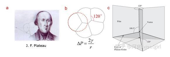 泡沫物理學(xué)集中于研究泡沫的結(jié)構(gòu)、靜力學(xué)、動態(tài)演變及排液等內(nèi)容。它是一個十分古老的學(xué)科,由比利時物理學(xué)家Plateau在19世紀中葉開創(chuàng)(圖2a)。Plateau在數(shù)十年的失明的時光里,依舊通過指導(dǎo)他侄子做試驗,堅持研究肥皂泡薄膜的幾何形態(tài)及其背后隱藏的力學(xué)規(guī)律。1873年,他和侄子把自己的實驗現(xiàn)象和分析結(jié)果做了系統(tǒng)整理,以法文發(fā)表,從此把對泡沫結(jié)構(gòu)的研究由定性印象推到了量化階段,開創(chuàng)了泡沫物理學(xué)(Ref 2)。在泡沫靜力學(xué)方面,Plateau的主要貢獻在于其提出了干泡沫的靜態(tài)結(jié)構(gòu)力學(xué)的三定律,它是后續(xù)泡沫研究的基石: