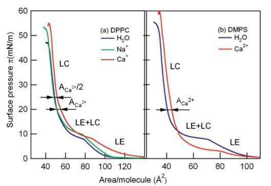 對于1 M Ca2+溶液上的DMPS單分子膜,與觀察到的純水共存區(qū)的π)10 mN/M壓力相比,LE+LC平臺壓力降低到π)5 mN/M;在較高的表面壓力(π>20 mN/m)下,兩條等溫線的位移保持等于Ca2+足跡,4?2/脂,未觀察到明顯轉(zhuǎn)變?yōu)?:1脂/Ca2+復合物。