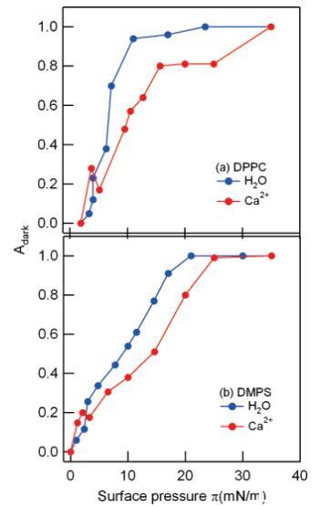 圖4:。在凈水(藍色)和1 M CaCl2溶液(紅色)上,DPPC(a)和DMPS(b)單分子膜的熒光圖像中暗有序LC域的部分面積Adark隨表面壓力的變化。注意周圍標記的局部最大值~在存在Ca2+離子的情況下,兩種脂質(zhì)均為3 mN/m。