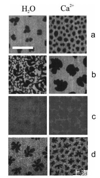 圖3:水上DPPC(a、b、c)和DMPS(d)單層的熒光圖像(左圖)和1 M CaCl2溶液(右圖),π)4 mN/M(a)、π)6.5 mN/M(b)、π)35 mN/M(c)和π)2 mN/M(d)。單分子膜用5 mol%羅丹明PE標記:亮區(qū)對應(yīng)于LE相,暗區(qū)為LC結(jié)構(gòu)域。比例尺代表15μm。所有圖像的對比度都相同。