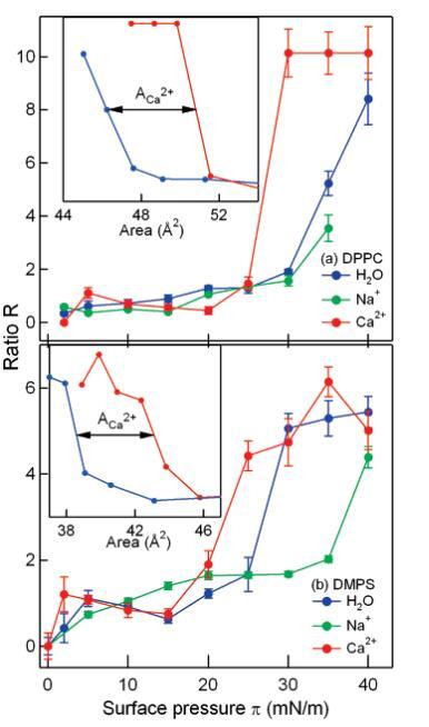 圖6:。作為DPPC(a)和DMPS(b)單分子膜表面壓力的函數(shù),CH3和CH2對稱拉伸振子強度的比值R:純水(藍色)、1 M NaCl溶液(綠色)和1 M CaCl2溶液(紅色)。由于單分子膜的崩塌,在π)40 mN/m時,無法測定Na+-DPPC的比值R。由于壓縮單層膜的νsCH2振幅的不確定性,在較高壓力下,誤差條較大。插圖顯示了作為每種脂質(zhì)面積函數(shù)顯示的比率R。請注意~4?2/脂質(zhì)置換(解釋為Ca2+足跡),與圖2中的等溫線一致。