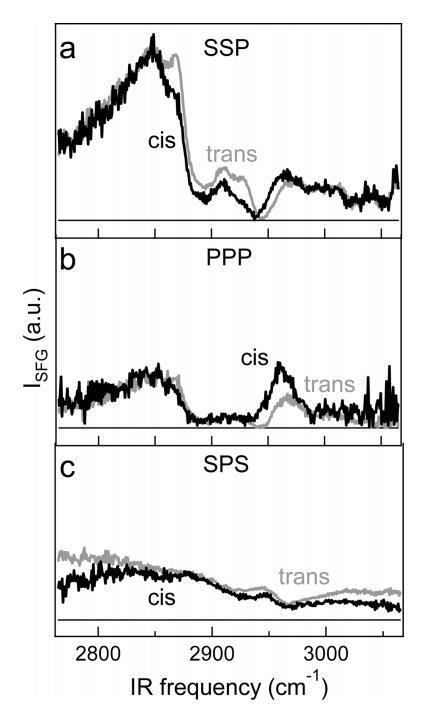 圖5:。(a)在P的反式和順式狀態(tài)下,DT-Azo-5P的純單層在65?2處的歸一化VSFG光譜與SSP極化分別為6和20 mN/m。(b)與a部分類似,但PPP極化。(c)反、順態(tài)SPS極化中的SFG譜(~每分子78?2),壓力為2和15 mN/m。三個(gè)面板具有相同的垂直刻度。