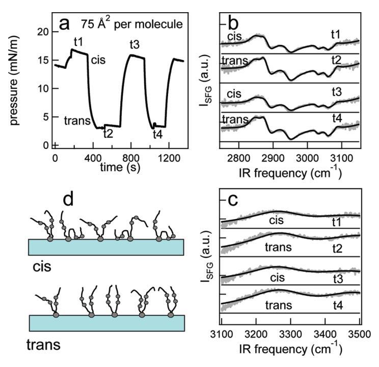 圖4:(a)在每分子75?2的面積處,脂質(zhì)/H2O界面處的光開關(guān)脂質(zhì)的表面壓力作為時(shí)間的函數(shù)。370和450 nm光照射~100秒分別產(chǎn)生cis(高壓)和trans(低壓)狀態(tài)。壓力的微小劇烈波動(dòng)是由于樣品高度的變化,以校正水的蒸發(fā)。(b和c)CH和OH區(qū)域(灰色)中相應(yīng)的VSFG光譜,以及洛倫茲線形狀模型的擬合(見正文)。為了清晰起見,對(duì)光譜進(jìn)行了偏移。t1至t4對(duì)應(yīng)于面板a中進(jìn)行光譜測(cè)量的時(shí)間。(d)脂質(zhì)尾部方向示意圖。光開關(guān)脂質(zhì)的偶氮苯部分用灰色圓圈表示。
