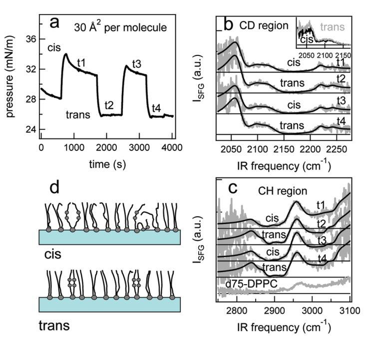 圖7:。結(jié)果:對(duì)于1:5的DT Azo-5P/d75 DPPC混合物,在脂質(zhì)/水界面上,每個(gè)分子的面積為30?2。(a)表面壓力與時(shí)間的關(guān)系。370和450 nm光照射~100秒分別產(chǎn)生cis(高壓)和trans(低壓)狀態(tài)。壓力的微小劇烈波動(dòng)是由于樣品高度的變化,以校正水的蒸發(fā)。順式狀態(tài)下表面壓力的降低可能是由于單層的松弛或膠束或囊泡的形成減少了表面的脂質(zhì)量。(b)相應(yīng)的VSFG光譜(灰色)以及CD區(qū)域的擬合。為了清晰起見,對(duì)光譜進(jìn)行了偏移。插圖顯示了相互重疊的反式和順式光譜,以強(qiáng)調(diào)差異。(c)VSFG光譜(灰色)與fits一起引導(dǎo)眼睛進(jìn)入CH區(qū)域。底部曲線顯示了P下純d75 DPPC的光譜~40 mN/m.(d)脂尾方向示意圖。光開關(guān)脂質(zhì)的偶氮苯部分用灰色圓圈表示。