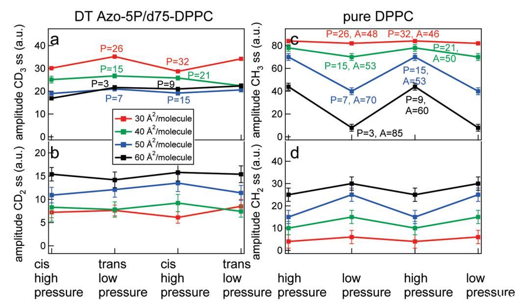 圖8:。d75 DPPC與DT Azo-5P比例為5:1的實(shí)驗(yàn)中d75 DPPC的擬合結(jié)果(左)和純正常DPPC的擬合結(jié)果(右)。(a)CD3對(duì)稱拉伸振動(dòng)模式的振幅隨不同密度光開關(guān)脂質(zhì)狀態(tài)的變化;(b)CD2對(duì)稱拉伸振動(dòng)模式的振幅隨不同密度光開關(guān)脂質(zhì)狀態(tài)的變化;右圖顯示了純DPPC在可比壓力下與左圖相似的結(jié)果,其中(c)為CH3對(duì)稱拉伸振動(dòng)模式的振幅,(d)為CH2對(duì)稱拉伸模式的振幅。共振的寬度和頻率在擬合中是固定的。