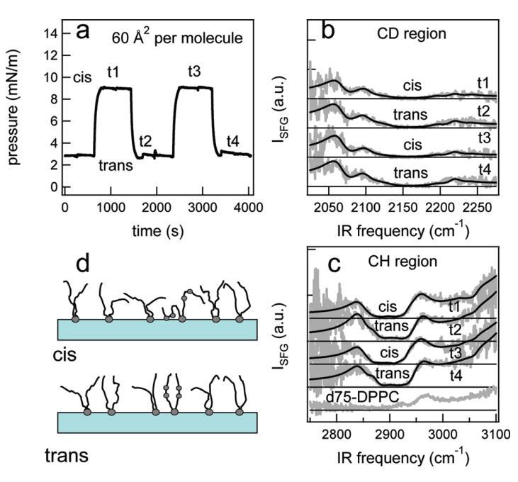 圖6:結(jié)果:DT Azo-5P/d75 DPPC的1:5混合物在脂質(zhì)/水界面上的面積為60?2/分子。(a)表面壓力與時(shí)間的關(guān)系。370和450 nm光照射~100秒分別產(chǎn)生cis(高壓)和trans(低壓)狀態(tài)。壓力的微小劇烈波動(dòng)是由于樣品高度的變化,以校正水的蒸發(fā)。(b)相應(yīng)的VSFG光譜(灰色)以及CD區(qū)域的擬合。為了清晰起見,對(duì)光譜進(jìn)行了偏移。(c)VSFG光譜(灰色)與fits一起引導(dǎo)眼睛進(jìn)入CH區(qū)域。底部曲線顯示了P下純d75 DPPC的光譜~40 mN/m.(d)脂尾方向示意圖。光開關(guān)脂質(zhì)的偶氮苯部分用灰色圓圈表示。