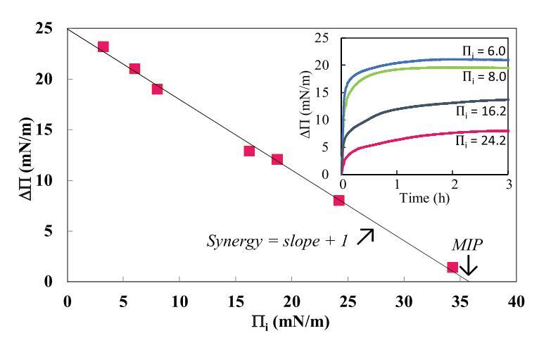 確定綁定參數(shù)的典型示例如圖2所示。實(shí)際上,對于6.0、8.0、16.2和24.2 mN/m的i,分別獲得了21.0、19.0、12.9和8.0 mN/m的(圖2插圖)。被繪制為i的函數(shù),導(dǎo)致負(fù)斜率。因此,在DPPE存在的情況下,mNCS1的MIP值為35.8±1.1 mN/m,協(xié)同值為0.30±0.02。這種積極的協(xié)同作用表明mNCS1和這種脂質(zhì)單層之間發(fā)生了積極的相互作用。然后,以不同的i注射每種脂質(zhì)和MIP,并根據(jù)表面壓力動(dòng)力學(xué)計(jì)算協(xié)同值。