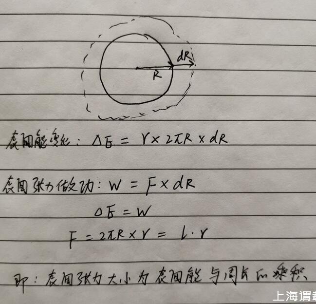 假設(shè)一半徑為R的圓面向外擴(kuò)張距離為dR,這個(gè)過程表面張力做功等于表面能的變化。具體推導(dǎo)如下圖。