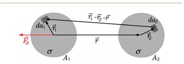 其中Ai表示域i的面積,dai表示其面積元素,-ri表示其相對于域中心的位置向量,i=1,2-r是從域1中心到域2中心的向量,如圖1所示。e0是真空介電常數(shù),ew和ea分別是水和空氣的相對介電常數(shù)。在這里,我們使用了Urbakh等人21的研究結(jié)果,該研究描述了由兩個半無限介質(zhì)包圍的薄電介質(zhì)層中偶極子之間的相互作用。