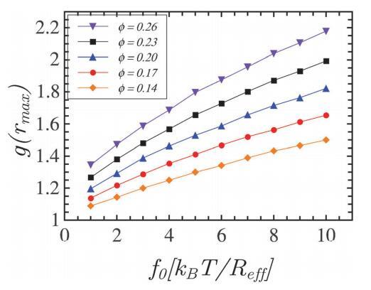 圖7顯示了面積分?jǐn)?shù)的五個代表值的g(rmax)作為f0的函數(shù),單位為kBT/Reff。