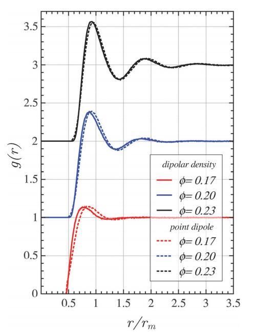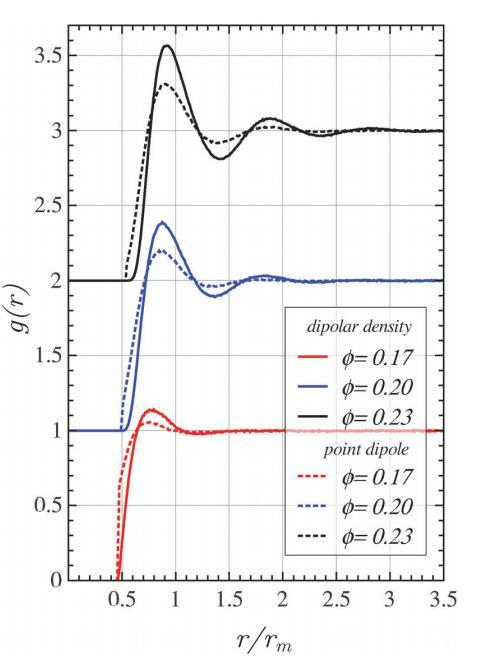 在第一個峰值位置和g(r)開始偏離零的小區(qū)域觀察到輕微差異。當(dāng)系統(tǒng)更加結(jié)構(gòu)化時,協(xié)議會得到改善。特別是,對于弱相互作用域,差異開始明顯。這些偏差是由于點偶極力在接觸時趨于有限值,而在偶極密度情況下,它會發(fā)散。因此,硬盤相互作用與點偶極子模型有關(guān)。