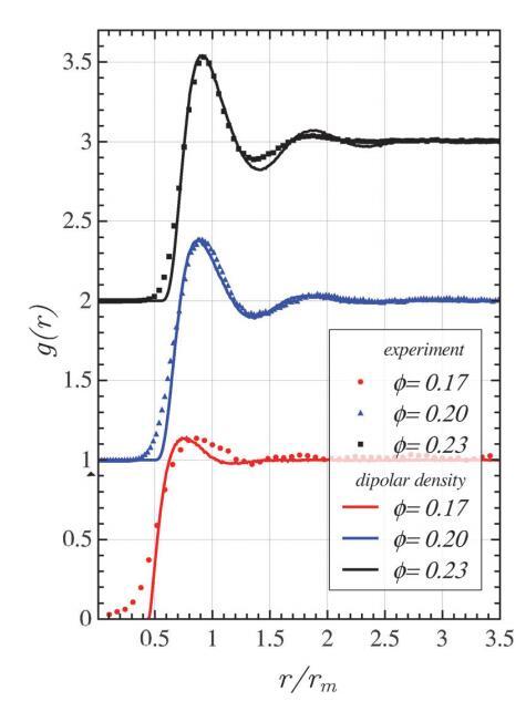圖9使用偶極密度和點偶極相互作用從BD模擬中獲得的徑向分布函數(shù)。選擇點-偶極相互作用強度f p0,使偶極密度模型的相應(yīng)g(rmax)與表2中的參數(shù)相匹配。當(dāng)f=0.17、0.20和0.23時,得到的f p0值分別為3.0、6.6和8.2[kBT/Reff]。為了清晰起見,數(shù)據(jù)已垂直移動。