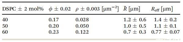 表1考慮的單分子膜的凝聚面積分?jǐn)?shù)、數(shù)密度、平均半徑和有效半徑。誤差由標(biāo)準(zhǔn)差確定,但f除外,f是通過改變閾值確定的,如實驗部分所述