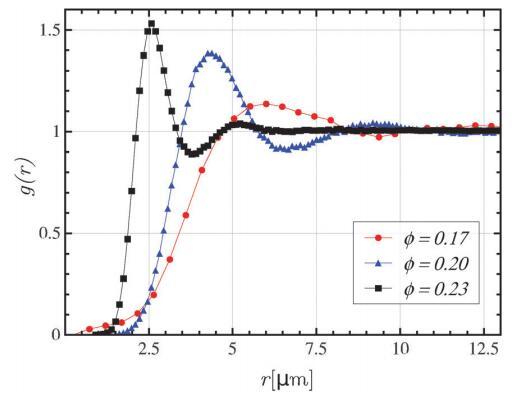 圖5顯示了三個實驗系統(tǒng)的徑向分布函數(shù)。在所有情況下,g(r)類似于液體,顯示出明確的第一峰(在rmax處),其表征了第一配位殼層,即最近鄰。此外,對于f=0.20和f=0.23的系統(tǒng),觀察到與第二配位殼對應(yīng)的標(biāo)記的第一最小值和第二最大值。由于“強”排斥作用,最近鄰距離遠(yuǎn)大于平均磁疇直徑。因此,硬核斥力不是結(jié)構(gòu)的決定因素,系統(tǒng)的特征長度是平均幾何距離rm=r 1/2。