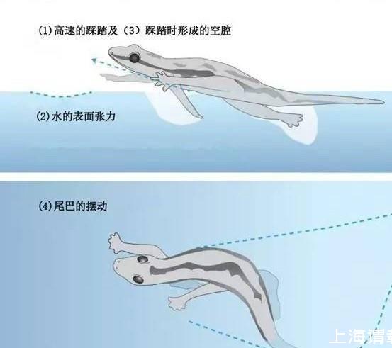 這種壁虎有大約6克重,相比于水黽來說它確實(shí)重多了,這似乎不具備利用水表面張力的能力。但壁虎有辦法,它有一身超級(jí)防水的皮膚和帶蹼的腳掌,通過四條腿大力拍擊水面,壁虎在它身體下方制造一個(gè)空氣的空腔,這時(shí)候水的表面張力會(huì)因?yàn)橛谢謴?fù)曲率最小化的趨勢(shì),從而將壁虎的身體向上方推。與此同時(shí),壁虎扭動(dòng)他的身體和尾巴,尾巴像一支船櫓一樣驅(qū)動(dòng)壁虎以1米/秒的速度在水面飛奔。