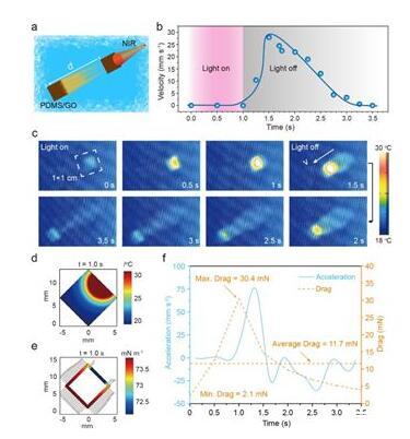 研究人員研制的驅(qū)動薄膜中具有光熱效應(yīng)極好的氧化石墨烯(GO)材料,可將光能轉(zhuǎn)換成熱能,當(dāng)光照射漂浮于水面上的驅(qū)動薄膜時(shí),薄膜會產(chǎn)生一定的溫度并傳遞給周圍的液體,造成局部水溫升高進(jìn)而影響水的表面張力。